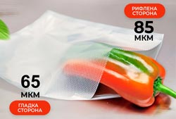 Плотность гладкой стороны 65 мкм, рифленой 85 мкм. Такая плотность обеспечивает высокую прочность и максимальную защиту от проколов и разрывов. В такие пакеты можно вакуумировать мясо, рыбу, овощи, фрукты. Однако для мяса с костями, замороженных продуктов предпочтительней более плотный пакет.