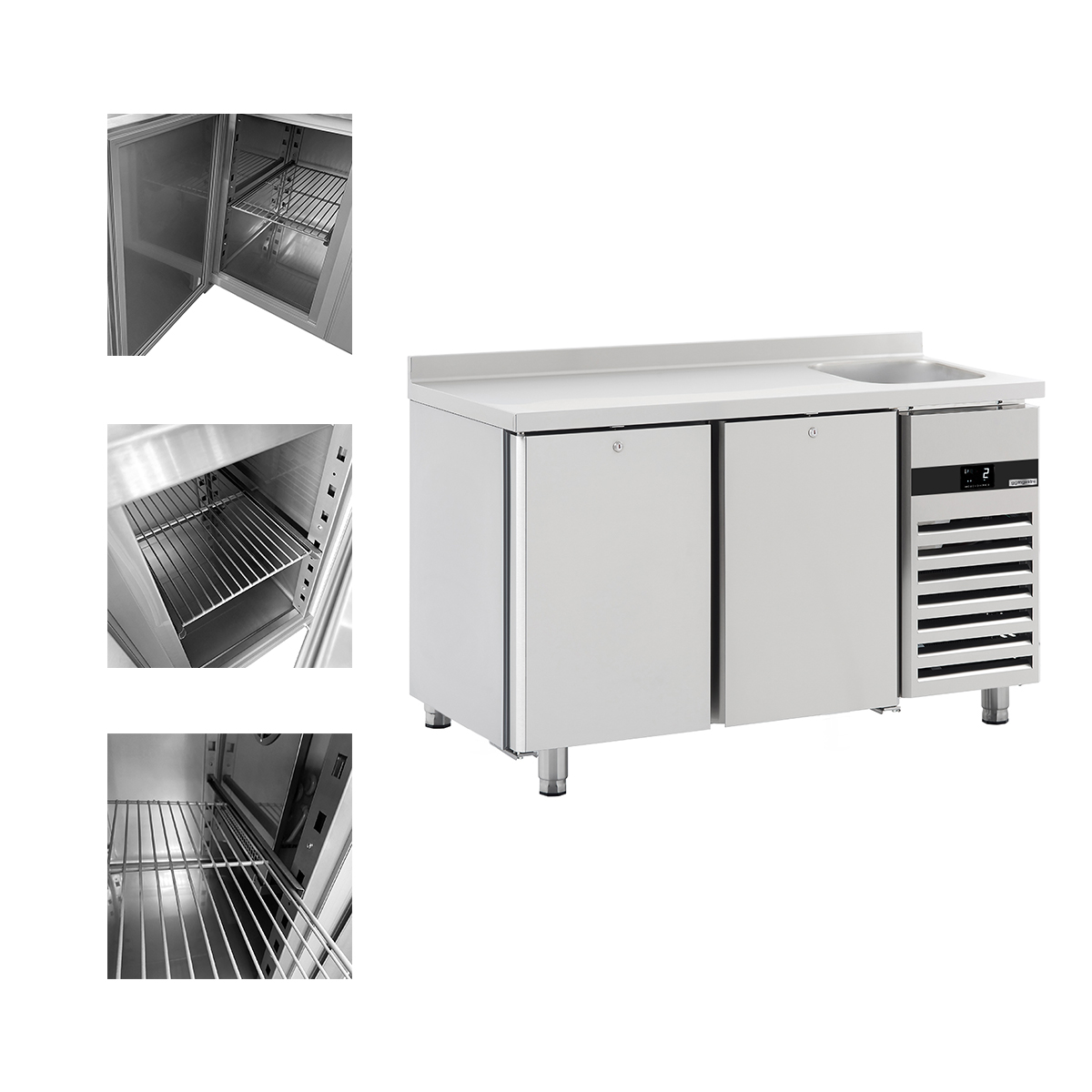 Холодильний стіл - 1,43 x 0,7 m - 2 скляних дверей, 1 з раковиною праворуч та з бортом - 270 Л GGM Gastro