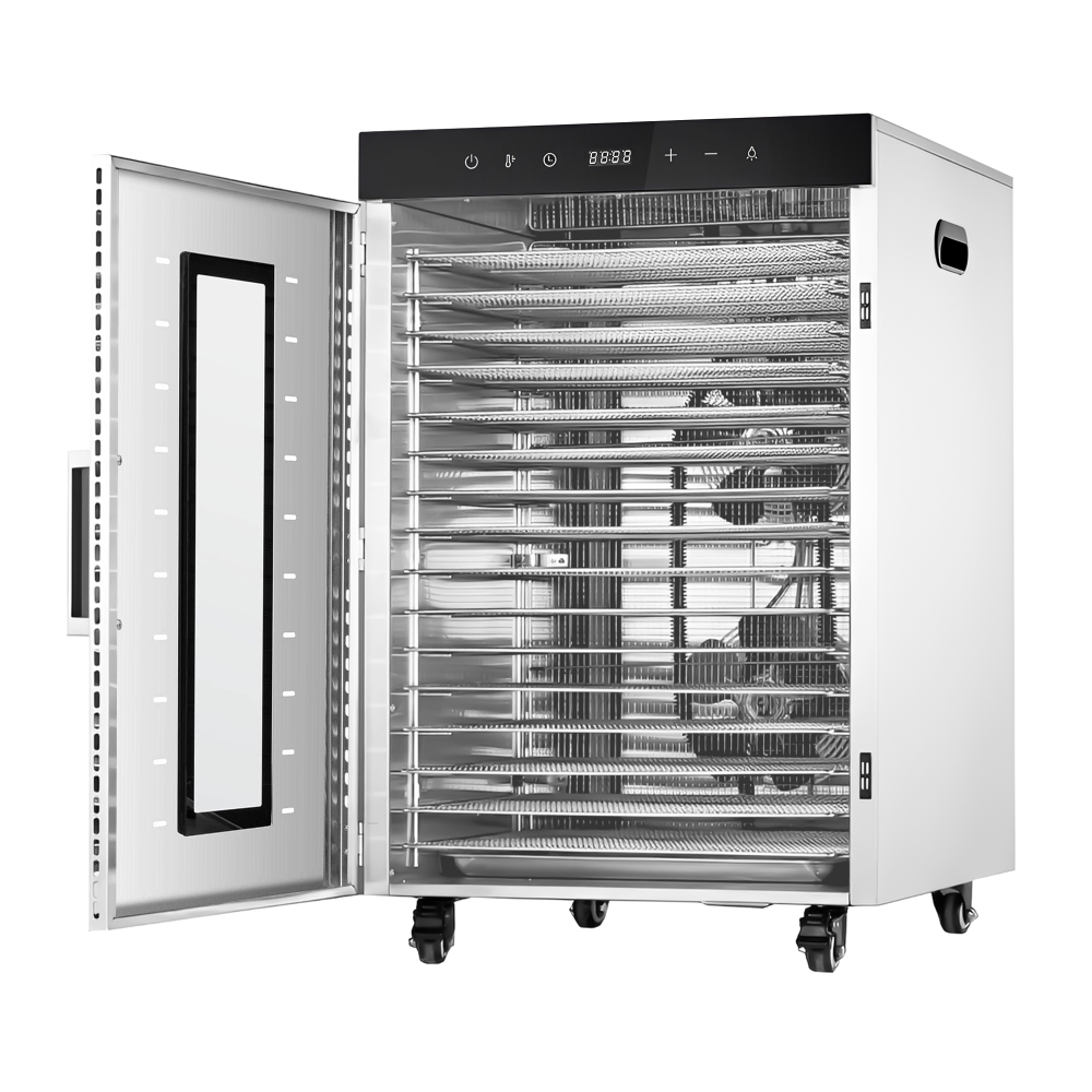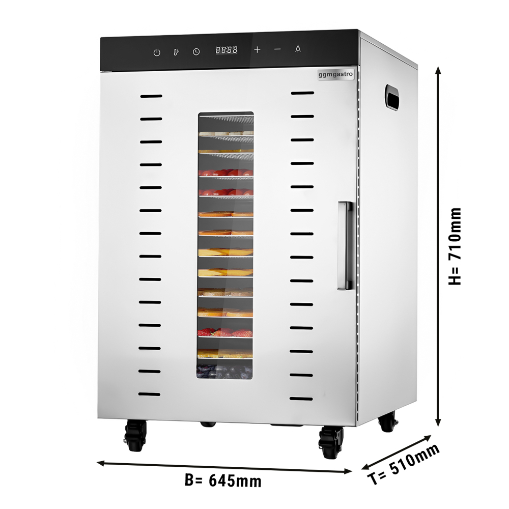 Профессиональный дегидратор GGM Gastro DGHB16 с горизонтальным обдувом и десятью лотками из нержавеющей стали используется для сушки фруктов, овощей, мяса, рыбы, грибов, для приготовления сухофруктов, пастилы