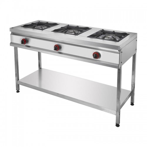 Плита промышленная газовая напольная 3-х конфорочная CEJ25 Remta, профессиональная. Устройство используется в кухнях объектов, предоставляющих промышленные услуги (предприятиях, дающих общественное питание, ресторанах, туристических объектах и буфетах) для эффективного приготовления пиши. Чугунные накладки на конфорки.  Подключается к баллонному газу.  Ножки, корпус, полочка : нержавеющая сталь. Ножки и полка съемные.