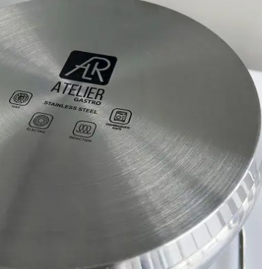 Преимущества приобретения кастрюли с крышкой Atelier Gastro 011251 Надежность • Производится из высококачественной пищевой нержавеющей стали 18/10 (18% хрома, 10% никеля): хром придает сплаву твердость и химическую стойкость, никель – износостойкость и яркость. • Ручки изготовлены из нержавеющей стали и надежно крепятся методом точечной пайки, что не позволяет нагреваться во время приготовления пищи. • Инкапсулирован-ное (многослойное) дно обеспечивает стойкость к коррозии. • Устойчивость к загрязнению. • В нижней части изделия используется многослойная технология, обеспечивающая хорошую теплопроводность.• Универсальность. Можно использовать на газовых, электрических и индукционных плитах, а также в духовке. • Уход. Кастрюля легко моется как вручную, так и в посудомоечной машине. Обобщенные характеристики: - Бренд: Atelier Gastro. - Страна производства: Китай. - Толщина металла – от 0,8 до 1,2 мм. - Размеры: объем 10,9 л, диаметр 240 мл, высота 240 мм - Материал: нержавеющая сталь AISI 430. - Крышка входит в комплект. - Многослойное (сэндвич) дно для высокой теплопроводности. - Можно мыть в посудомоечной машине.